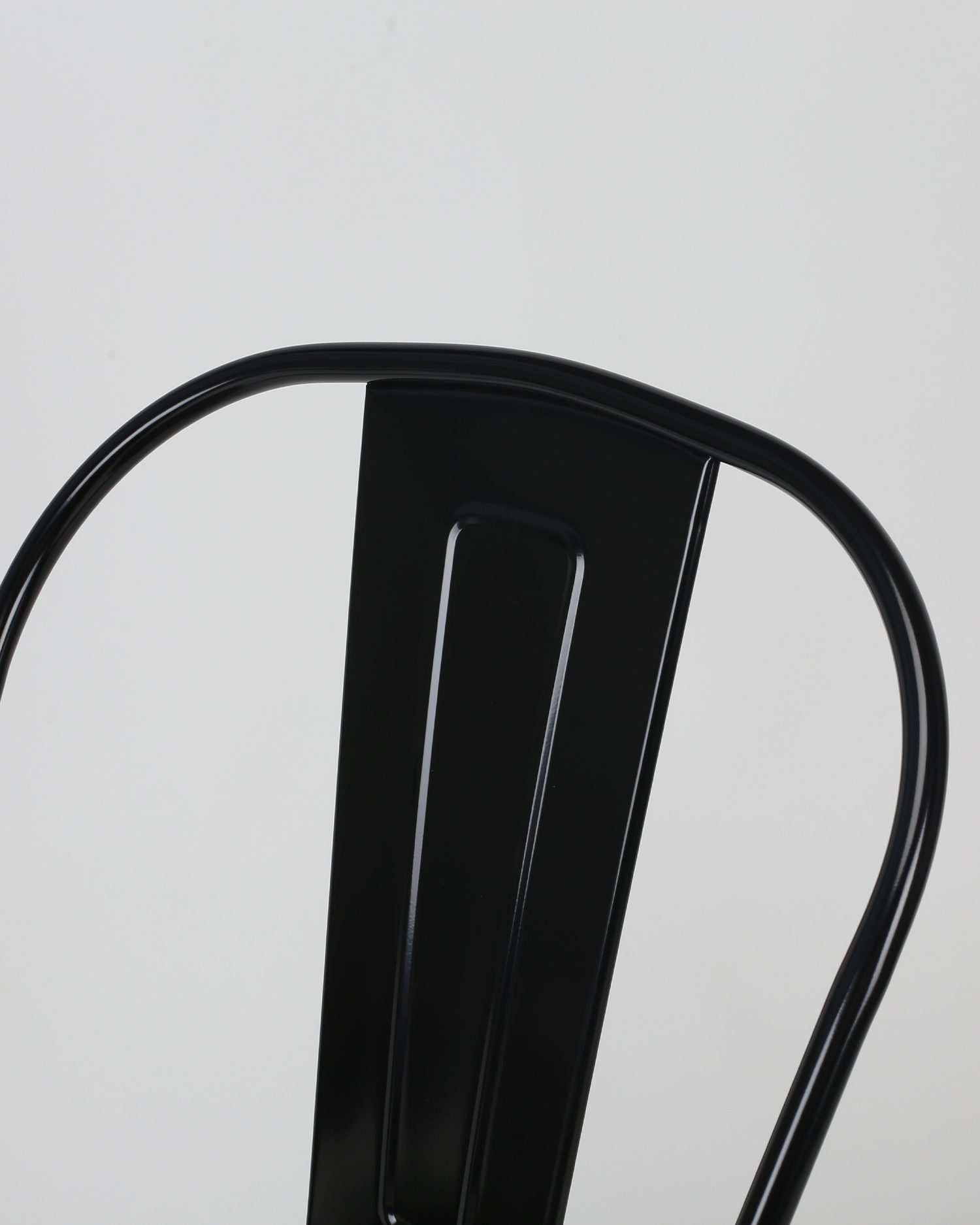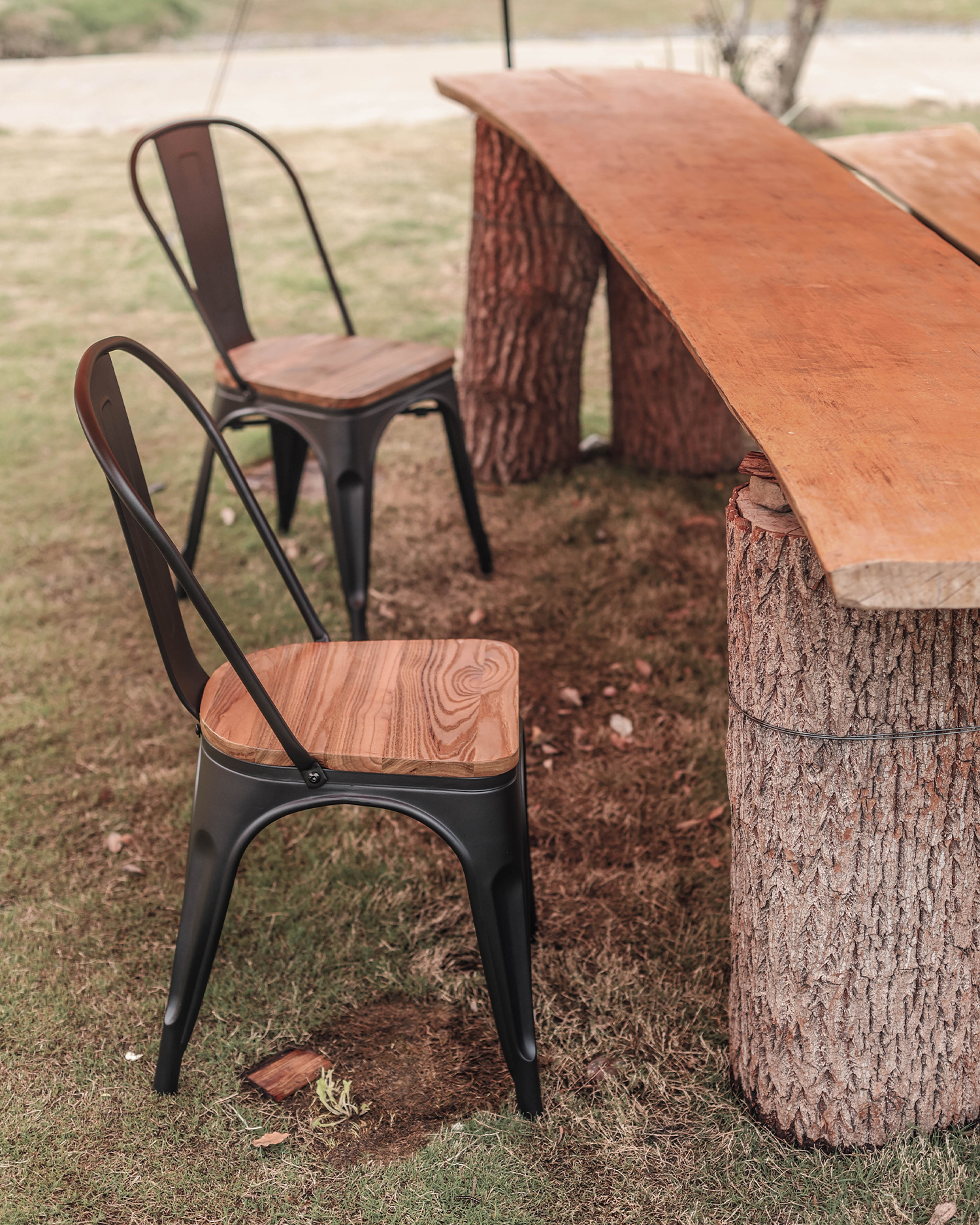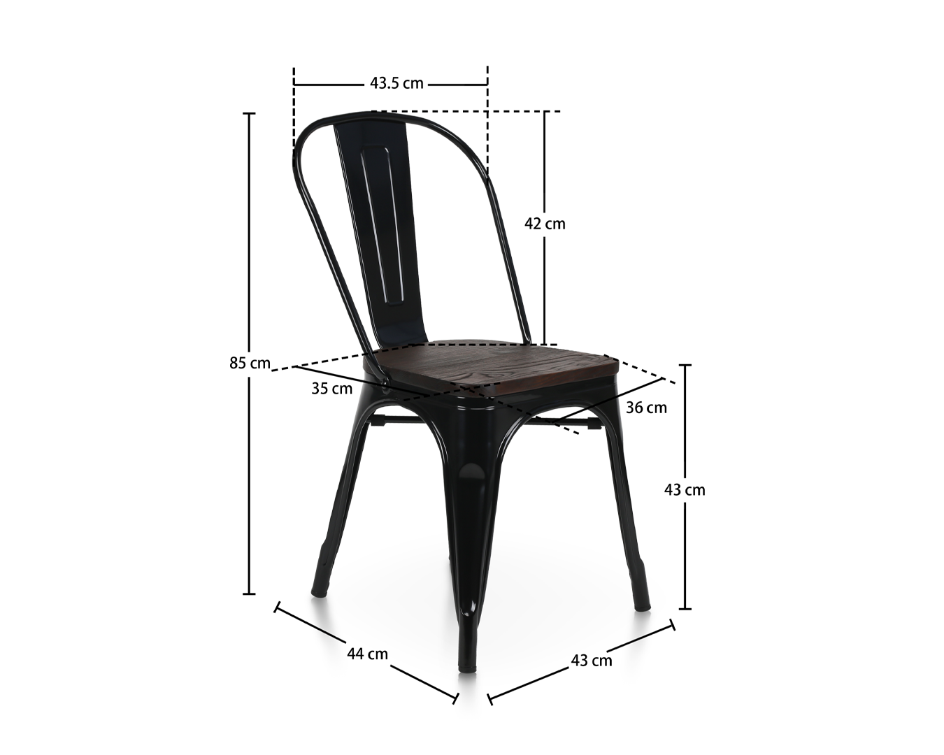 • Tämä tuoli on todistus teollisuuden estetiikan kestävästä vetoomuksesta, jossa on tyylikäs musta rautakehys, joka säteilee voimaa ja hienostuneisuutta. Puisen istuimen lisääminen tuo lämpimän, kutsuvan elementin, joka pehmentää tuolin teollisuusilua, mikä luo harmonisen tasapainon muodon ja toiminnan välillä.