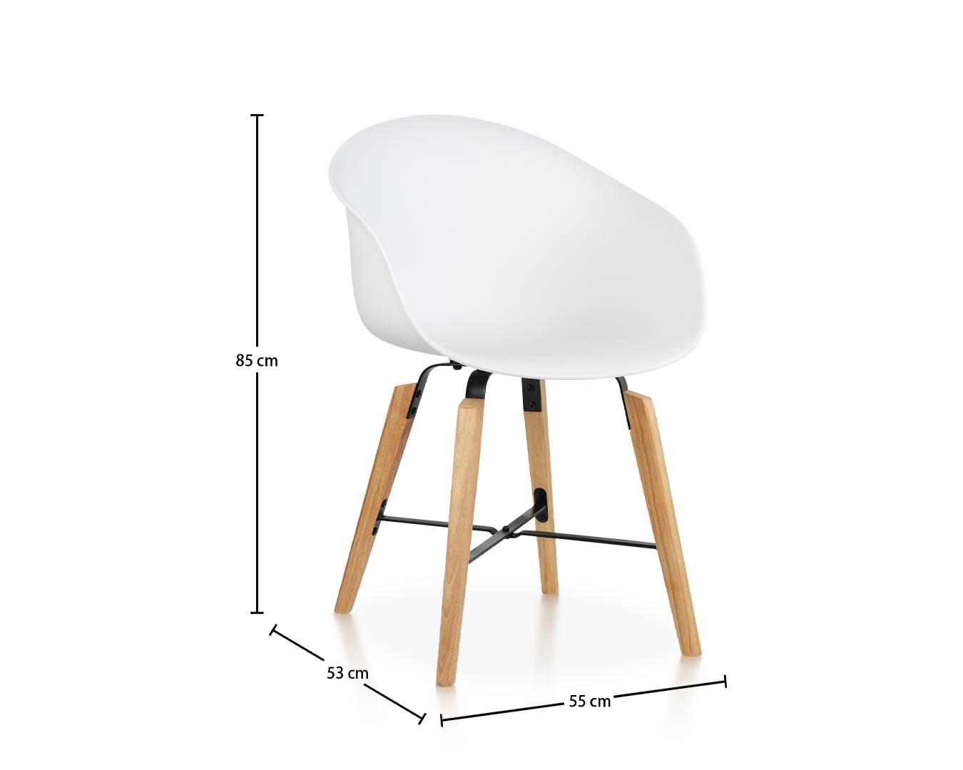 • Valettuun polypropeenista valmistettu istuin on kestävä ja helppo puhdistaa. Kumipuiset jalat ja mustat jauhepäällystetyt rautaliittimet lisäävät lämpöä ja kontrastia täysin valkoiseen ilmeeseen.