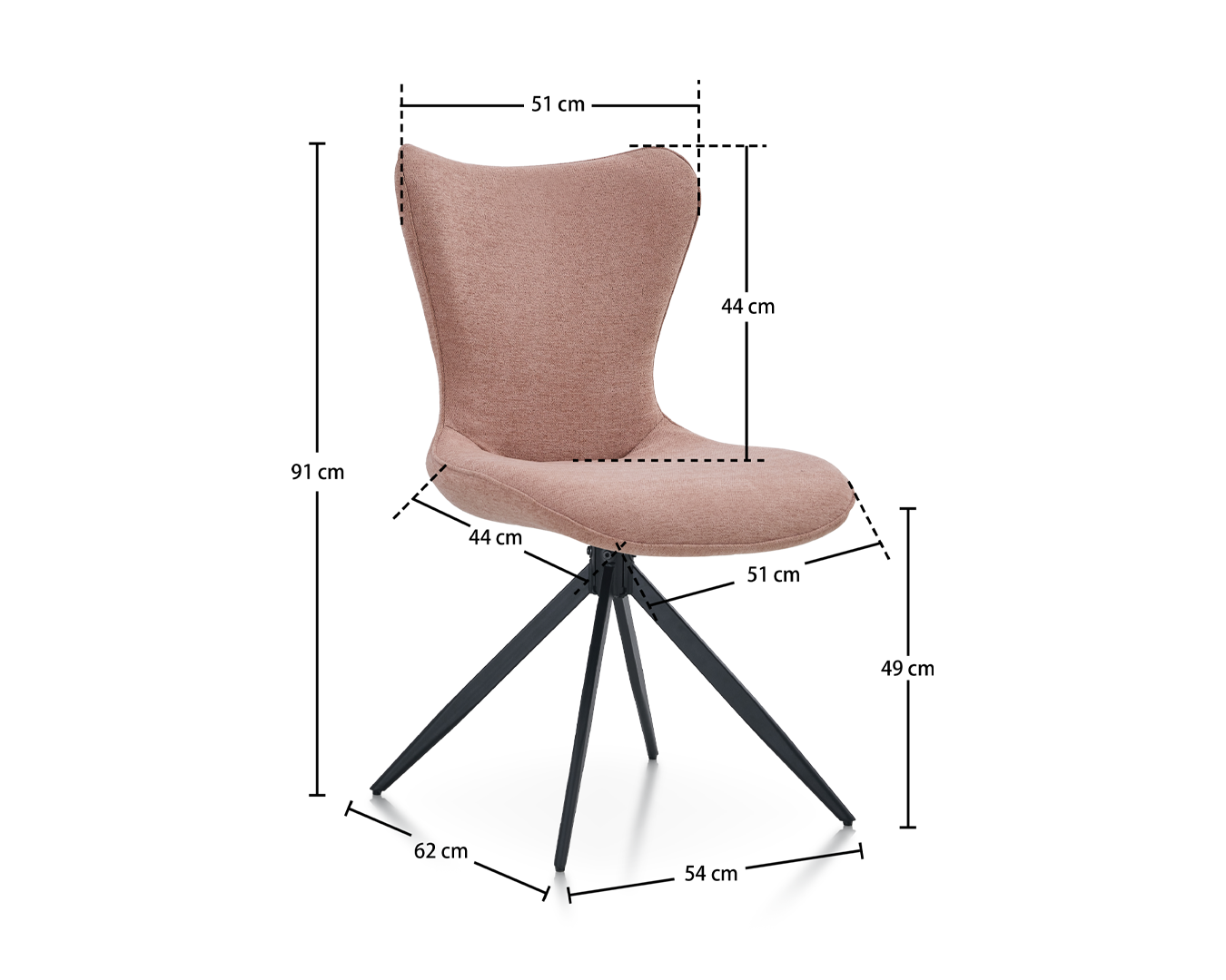 • Verhoiltu pehmeässä, punastuneessa vaaleanpunaisessa kankaassa se tarjoaa viihtyisän istuinkokemuksen lisääen samalla ripaus hienostuneisuutta mihin tahansa ruokasalitilaan. Tuolin tyylikäs muotoilua täydentää sen tukeva black metal -pohja, joka ei vain tarjoa vakautta, vaan myös parantaa sen nykyistä vetoomusta.