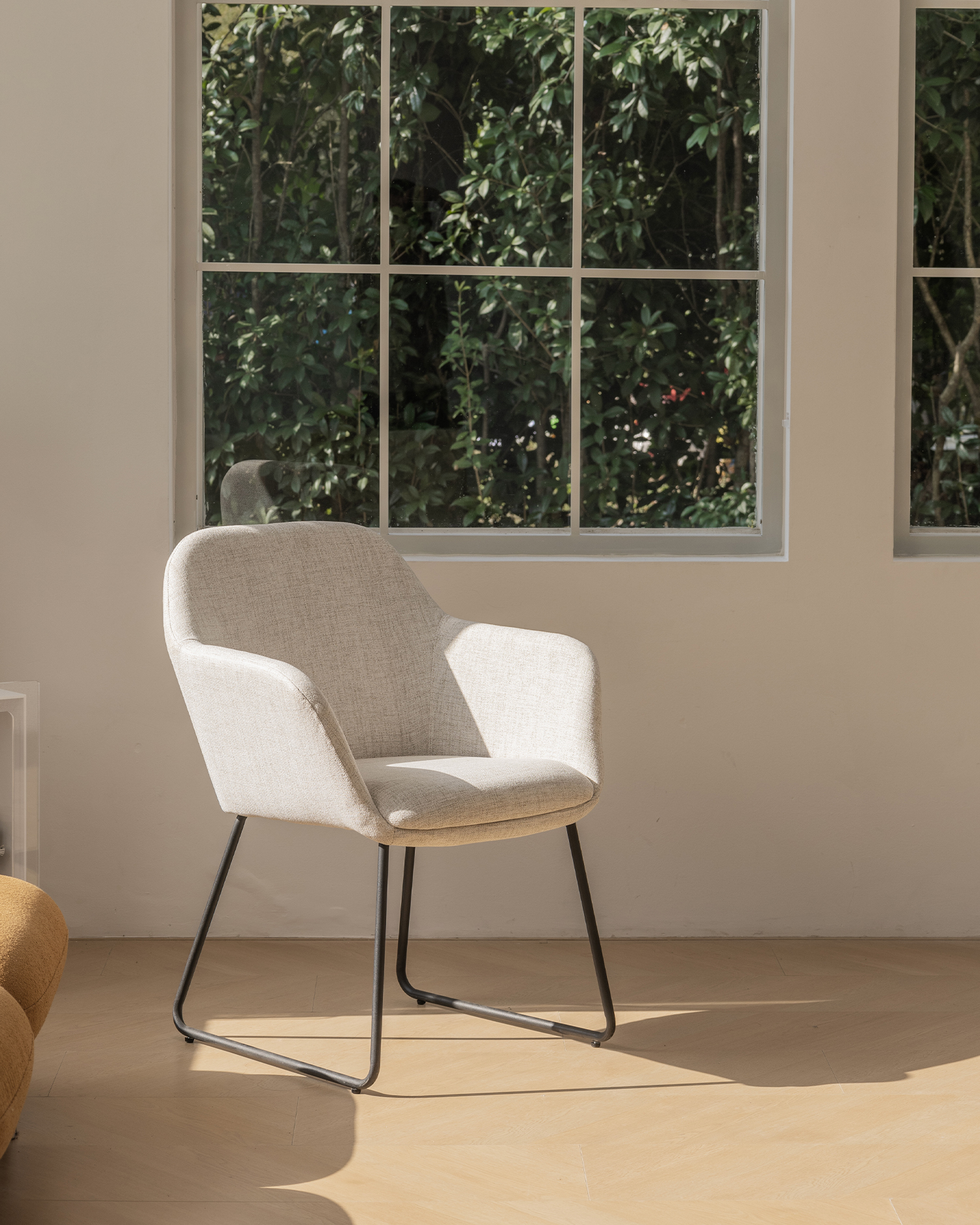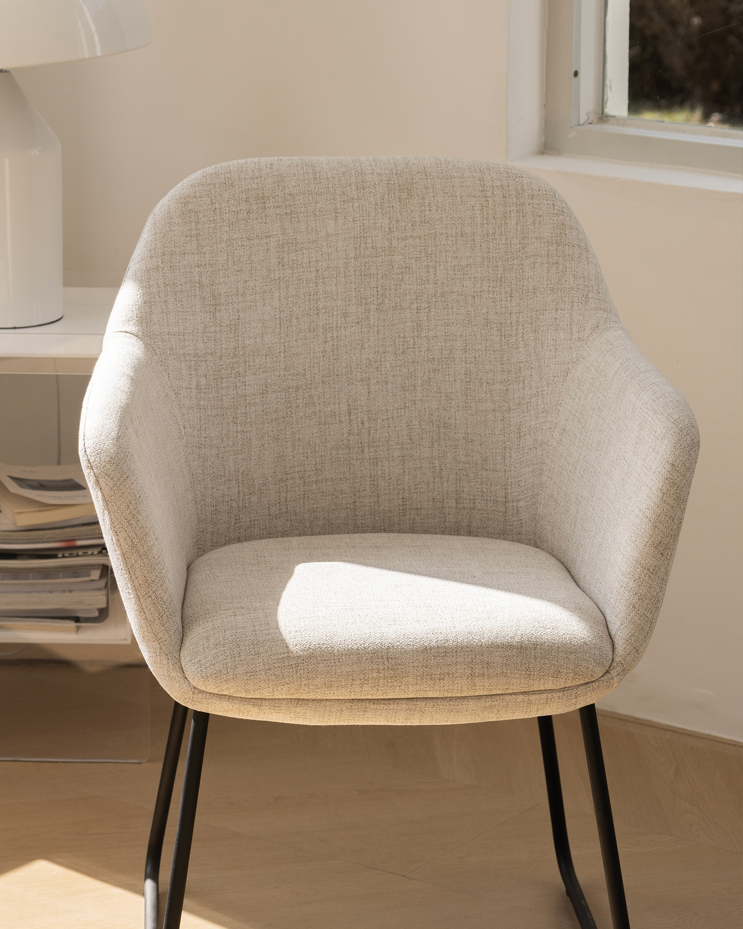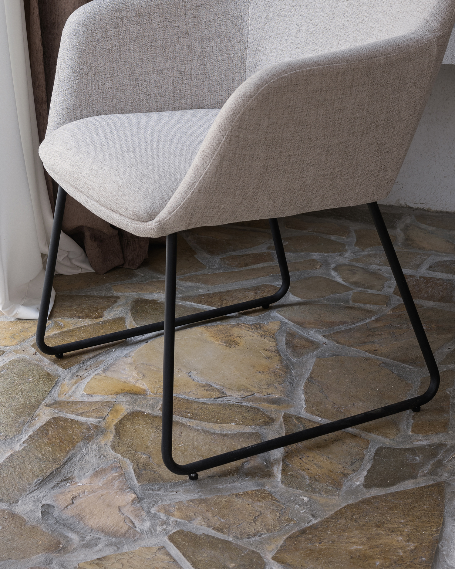 • Sen tyylikäs beige -verhoilu varmistaa maksimaalisen mukavuuden, kun taas kaareva selkänoja tukee selkärankaa vaivattomasti. Tuolin musta metalli jalat ovat sekä tyylikkäitä että kestäviä, mikä varmistaa vakauden ja pitkäikäisyyden.