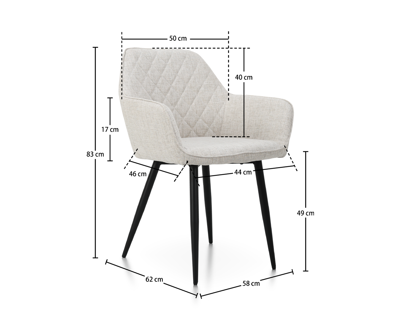 • Käsitetty tukevalla rautakehyksellä, joka varmistaa kestävyyden ja vakauden. Istuin ja selkänoja on pehmustettu tiheällä vaahdolla poikkeuksellisen mukavuuden vuoksi, mikä tekee siitä ihanteellisen pitkille illalliskeskusteluille tai rento perheen aterioille. Verhoilu on valmistettu korkealaatuisesta kankaasta, joka ei vain lisää ripausta eleganssia, vaan tarjoaa myös erinomaisen kulutuskestävyyden varmistaen, että tuoli pysyy koskemattomassa tilassa tulevina vuosina.