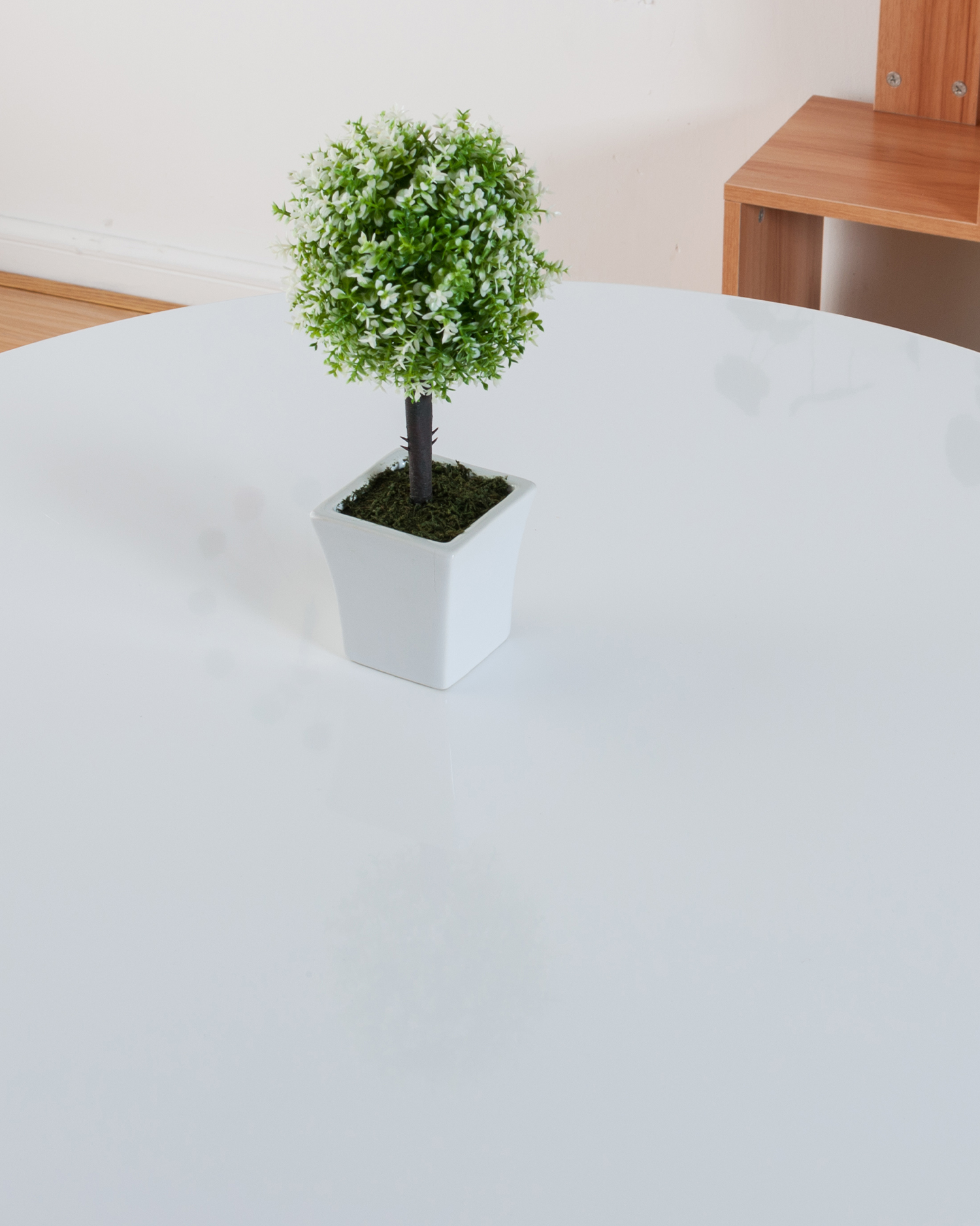 • Pöydän pyöreällä yläosalla, joka on valmistettu premium -tiheyslevystä, on turmeltumaton valkoinen pinta, joka herättää hienostuneisuutta ja yksinkertaisuutta. Luonnolliset puujalat tarjoavat lämpimän kontrastin valkoiselle pöytätasolle, mikä luo tasapainoisen ja harmonisen ilmeen. Jalkojen yhdistävä musta lankakehys lisää sekä voimaa että modernin estetiikan, mikä tekee tästä pöydästä erottuvan kappaleen missä tahansa huoneessa.